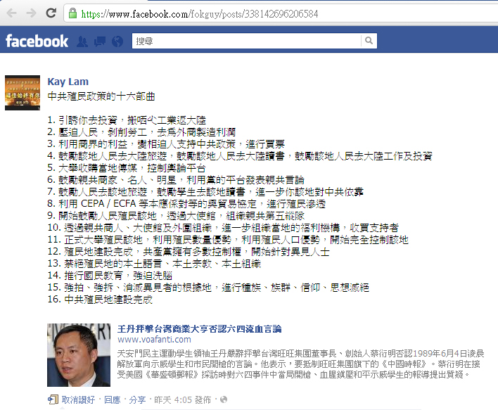 林忌昨日早上在 Facebook 借王丹批評蔡衍明否認六四流血言論時, 講到「中共殖民政策的十六部曲」